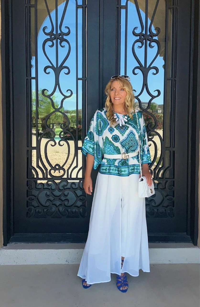 I added an oversized silk top and belted it. The flowy sheer skirt creates such nice lines. Putting a top over a jumpsuit is an easy way to create a new outfit